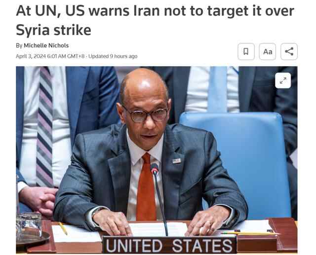 据路透社报道,当地时间4月2日,美方常驻联合国副代表罗伯特·伍德警告伊朗:不要因伊朗驻叙利亚大使馆遇袭而对美方进行报复。他还表示,美国政府没有在伊朗大使馆遇袭前收到以方消息。