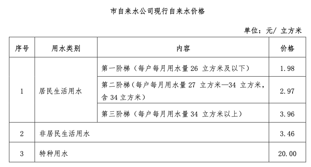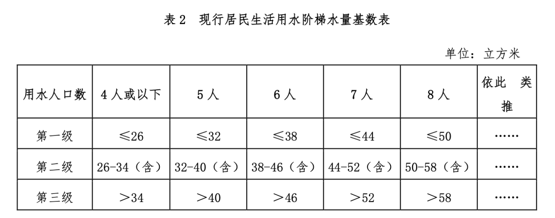此外,中心城区自2012年11月执行阶梯水价,按每户用水人口数4人(含4人及以下)为计量单位,超过4人可申请调整阶梯水量基数,每增加一人,两级阶梯水量基数上限分别增加6立方米。
