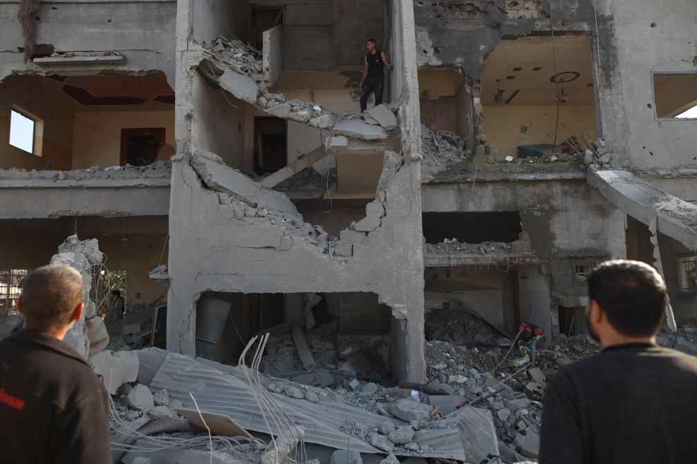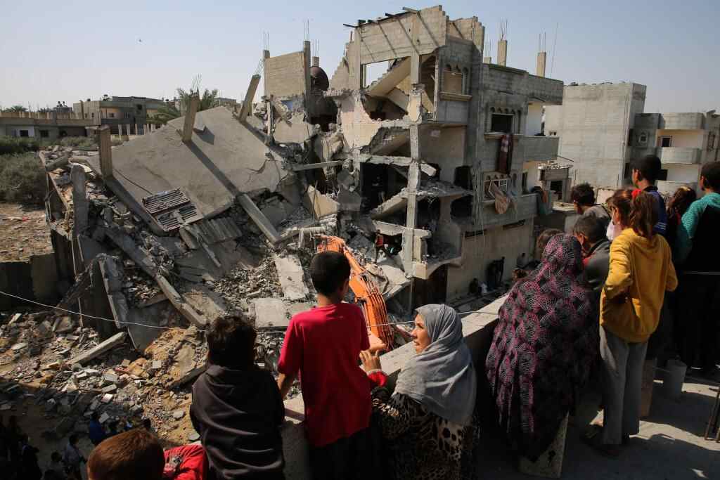 4月2日,在加沙地带南部城市拉法,人们查看被以军空袭后的建筑。新华社发(哈立德·奥马尔摄)