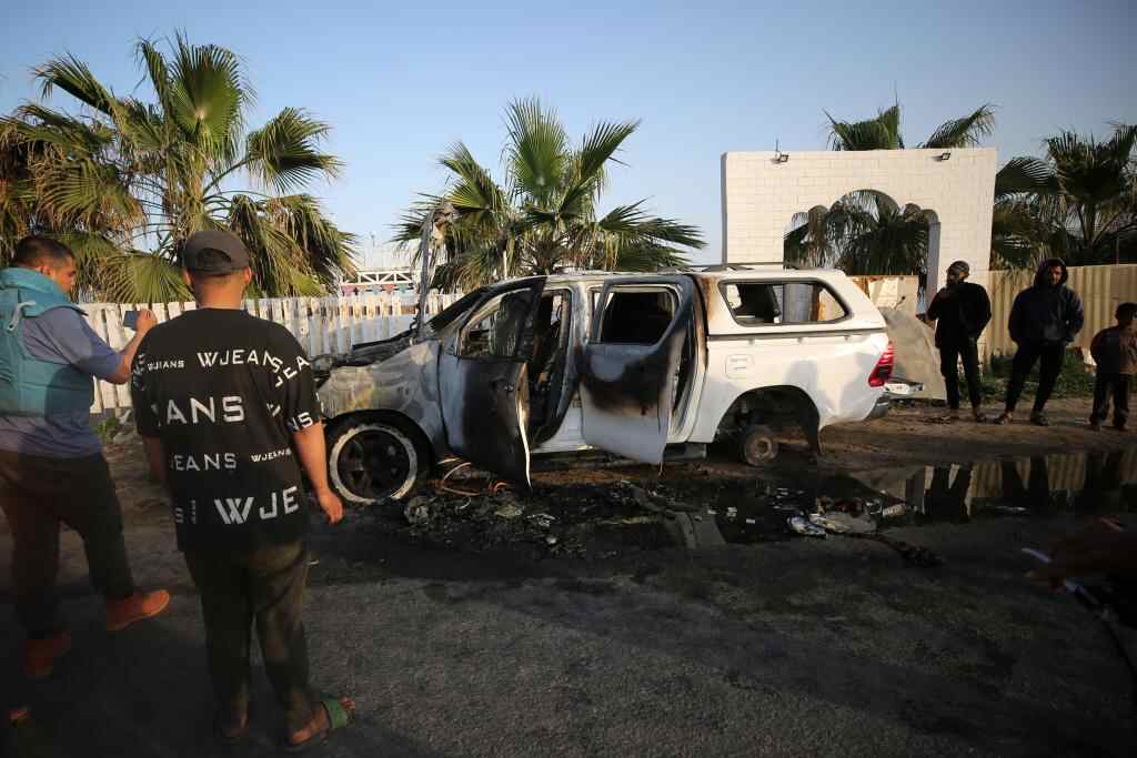 4月2日,在加沙地带中部代尔拜拉赫,巴勒斯坦人在空袭过后查看被毁的汽车。巴勒斯坦红新月会2日发表声明说,以色列军队1日晚空袭加沙地带中部城市代尔拜拉赫,造成慈善组织“世界中央厨房”7名工作人员死亡。新华社发(亚西尔·库迪摄)
