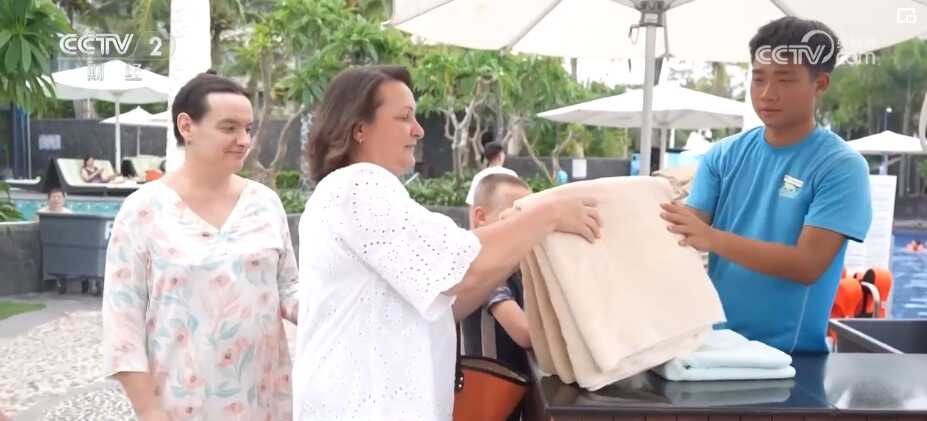 在三亚的海边,椰影婆娑、海浪翻滚,这里不仅有很多国内的游客,沙滩上也随处可见来度假的外国游客。他们或在沙滩上晒“日光浴”,或一家人漫步沙滩、逐浪嬉戏。