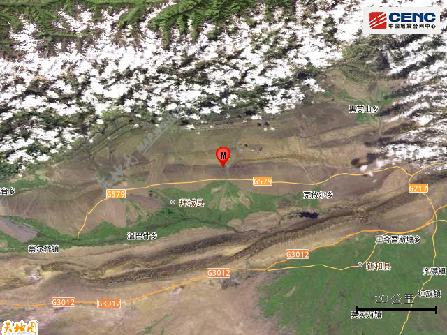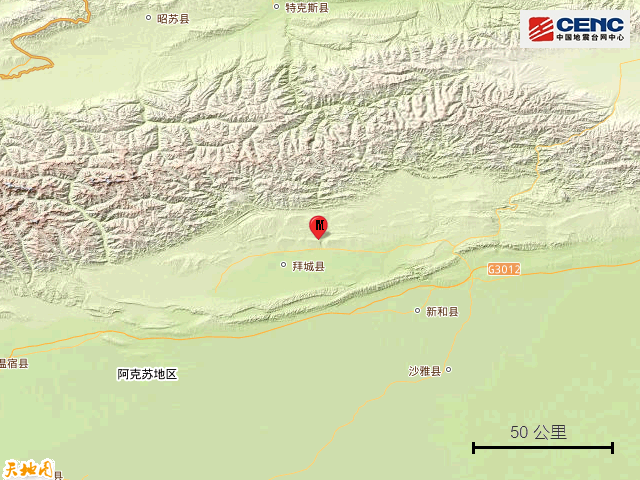 周边县城:震中距拜城县24公里、距新和县62公里、距库车市81公里、距沙雅县99公里、距特克斯县145公里,距阿拉尔市168公里,距乌鲁木齐市499公里。