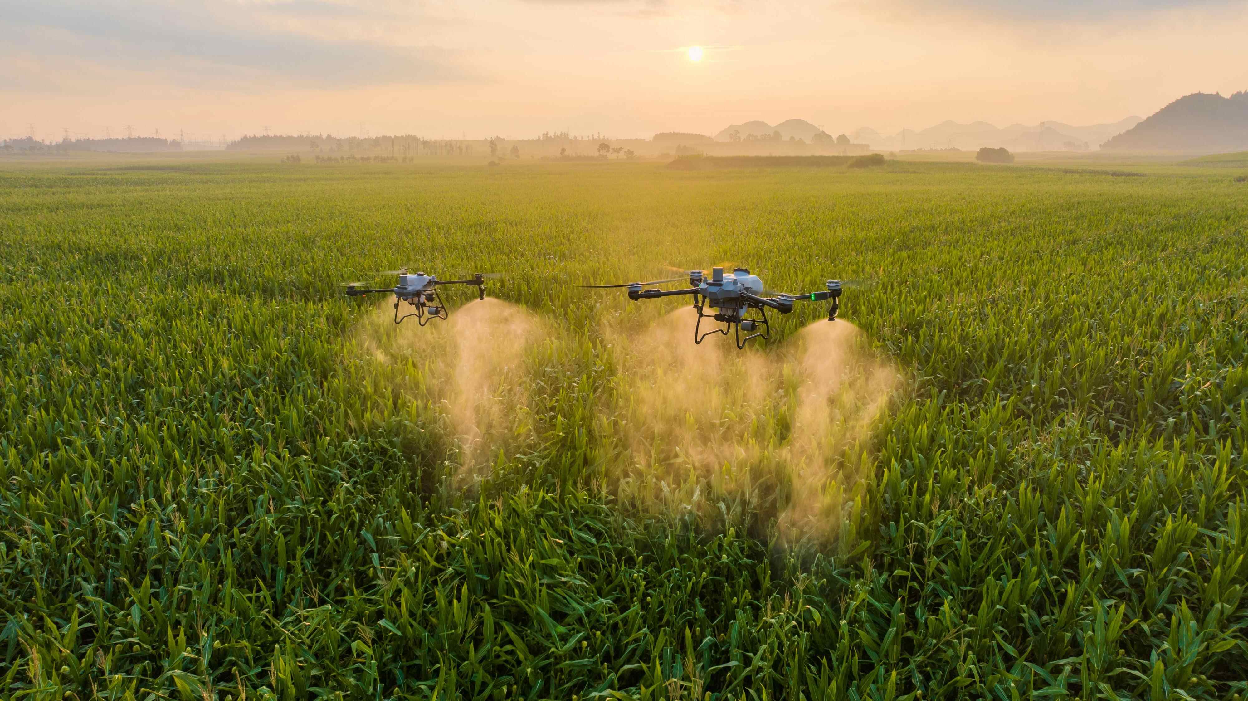 深圳大疆公司生产的农业无人机在田间作业
