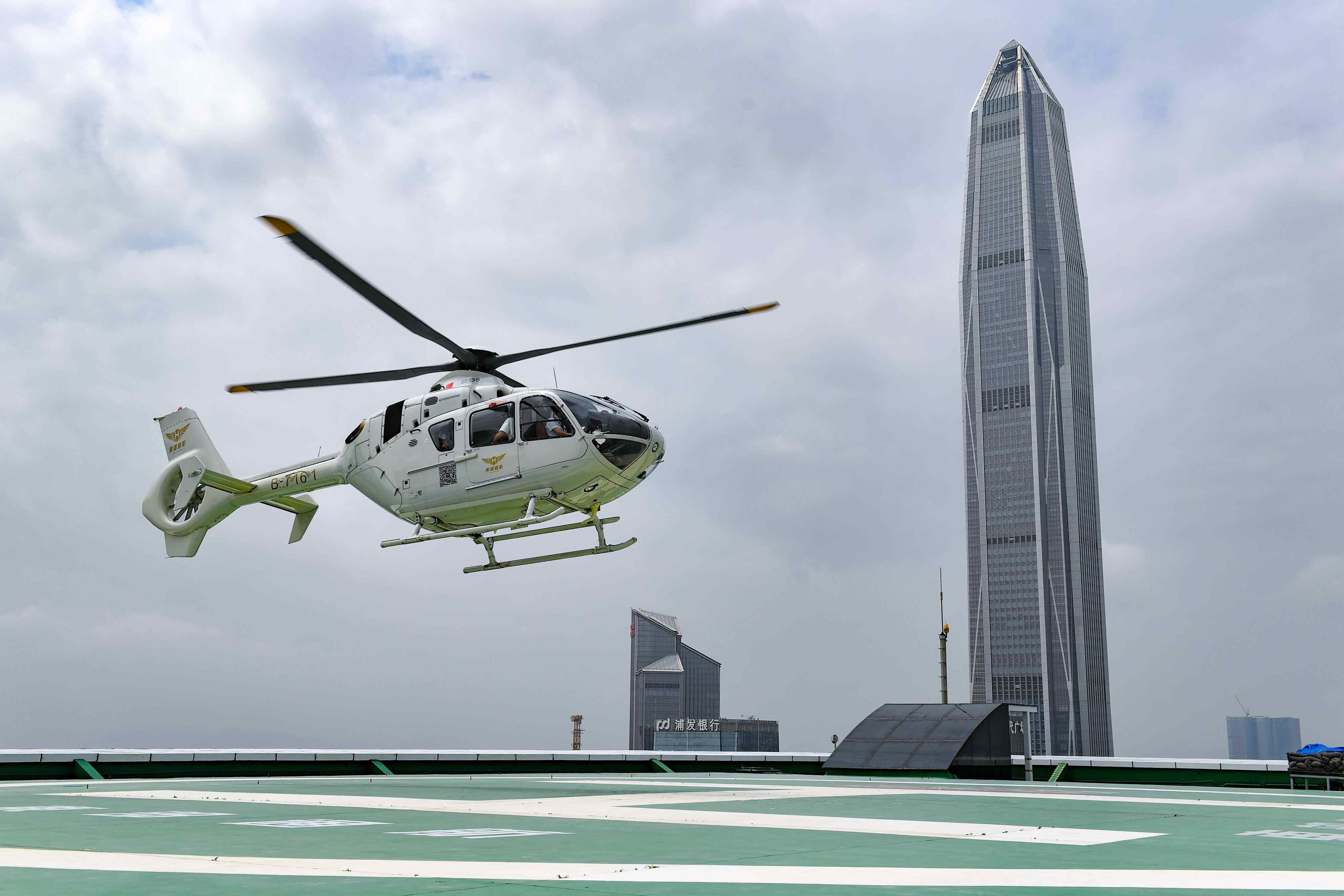 深圳发展低空经济,打造“天空之城”。图为直升机准备降落在深圳市中心的大中华直升机场。