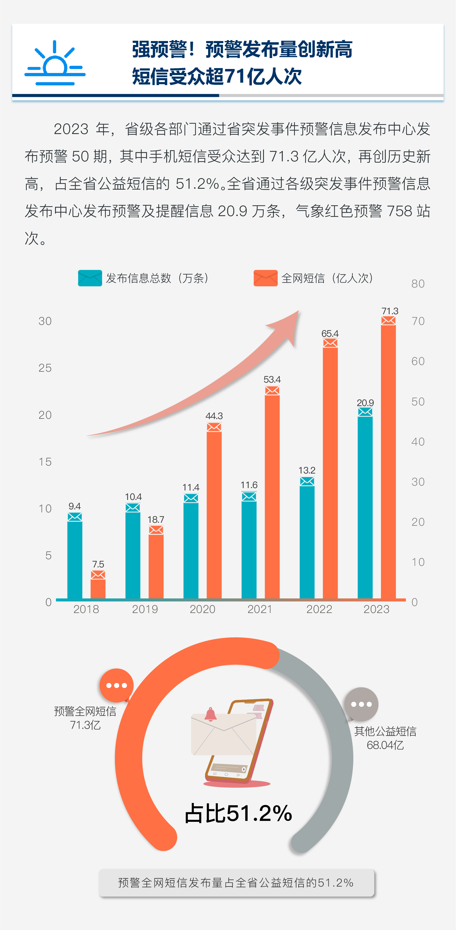 记者从《报告》获悉,2023年,省级各部门通过省突发事件预警信息发布中心发布预警50期,其中手机短信受众达到71.3亿人次,再创历史新高,占全省公益短信的51.2%。全省通过各级突发事件预警信息发布中心发布,气象红色预警758站次。