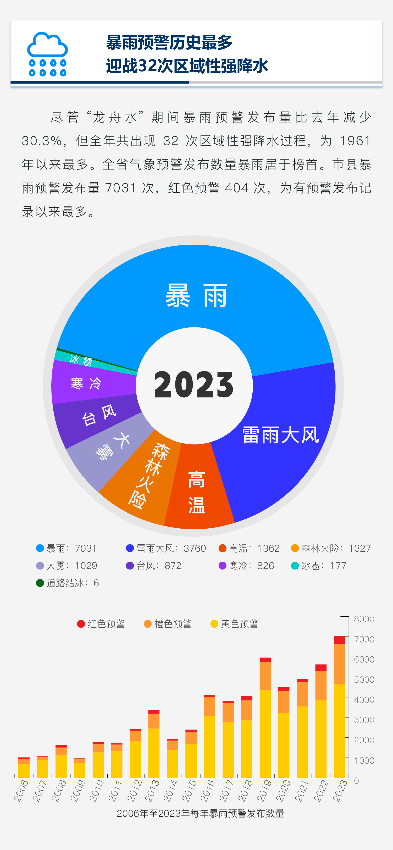 尽管去年“龙舟水”期间暴雨预警发布量比上一年减少30.3%,但去年全年共出现32次区域性强降水过程,为1961年以来最多。全省气象预警发布数量暴雨居榜首。市县暴雨预警发布量7031次,红色预警 404次,为有预警发布记录以来最多。