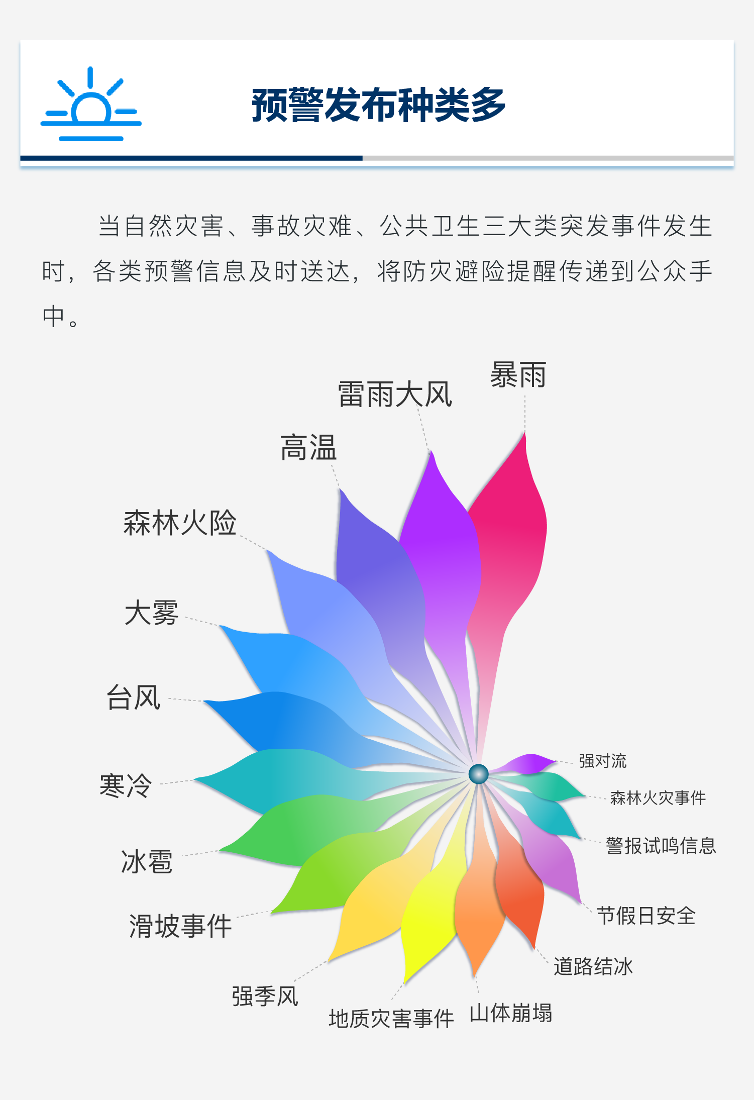 当自然灾害、事故灾难、公共卫生三大类突发事件发生时,各类预警信息及时送达,将防灾避险提醒传递到公众手中。
