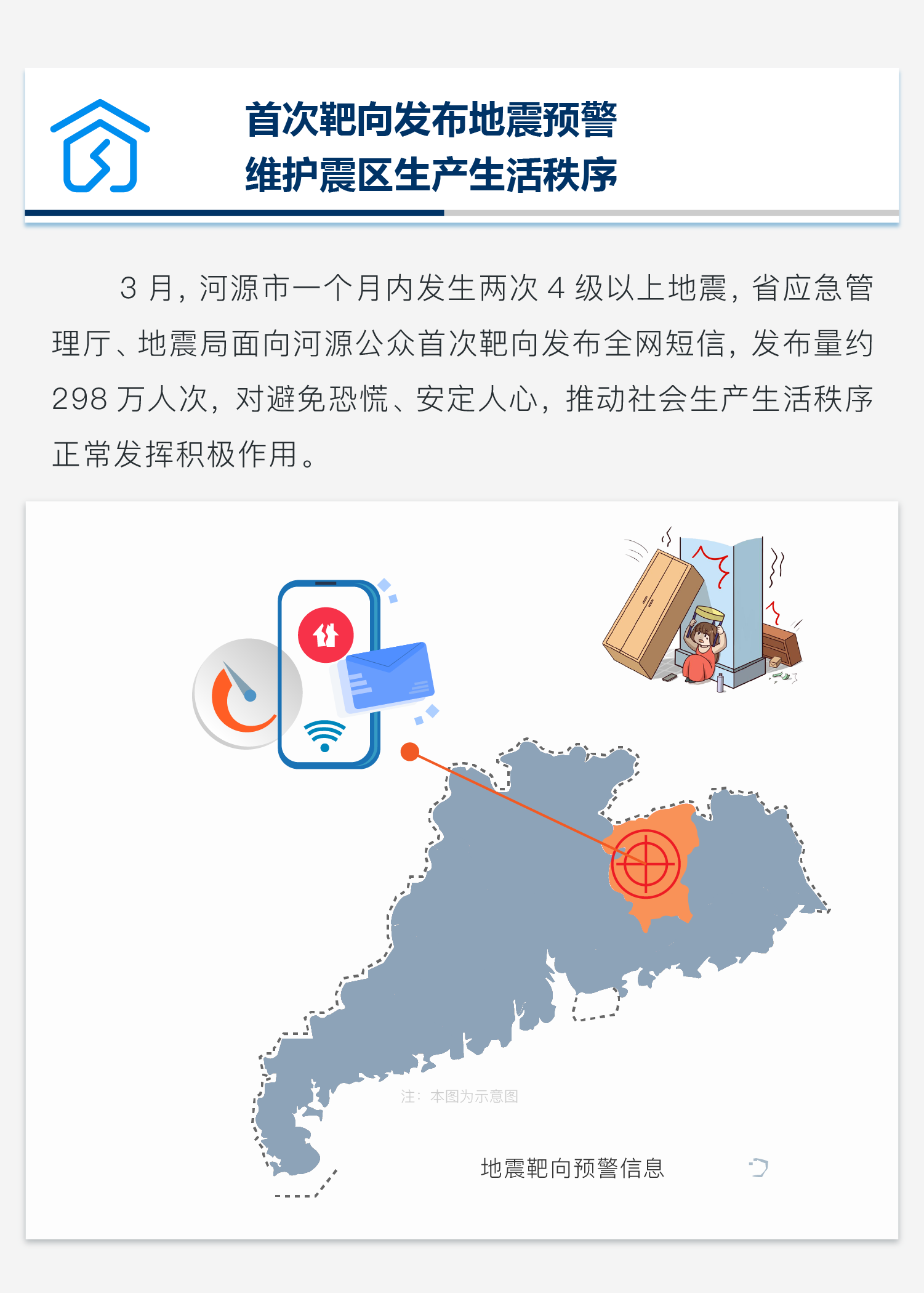 去年3月,河源市一个月内发生两次4级以上地震,省应急管理厅、地震局面向河源公众首次靶向发布全网短信,发布量约298万人次,对避免恐慌、安定人心,推动社会生产生活秩序正常发挥积极作用。