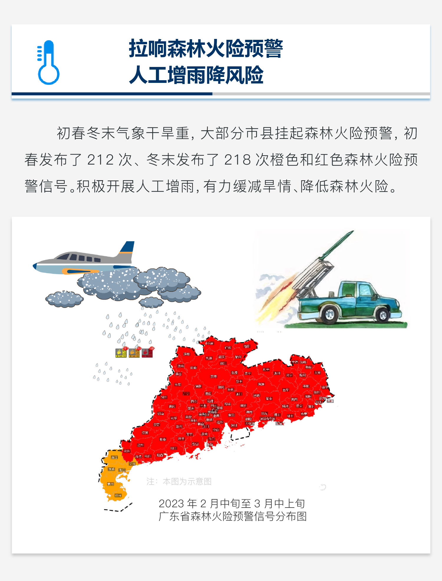 初春冬末气象干旱严重,大部分市县挂起森林火险预警,初春发布了212次、冬末发布了218次橙色和红色森林火险预警信号。积极开展人工增雨,有力缓解旱情、降低森林火险。
