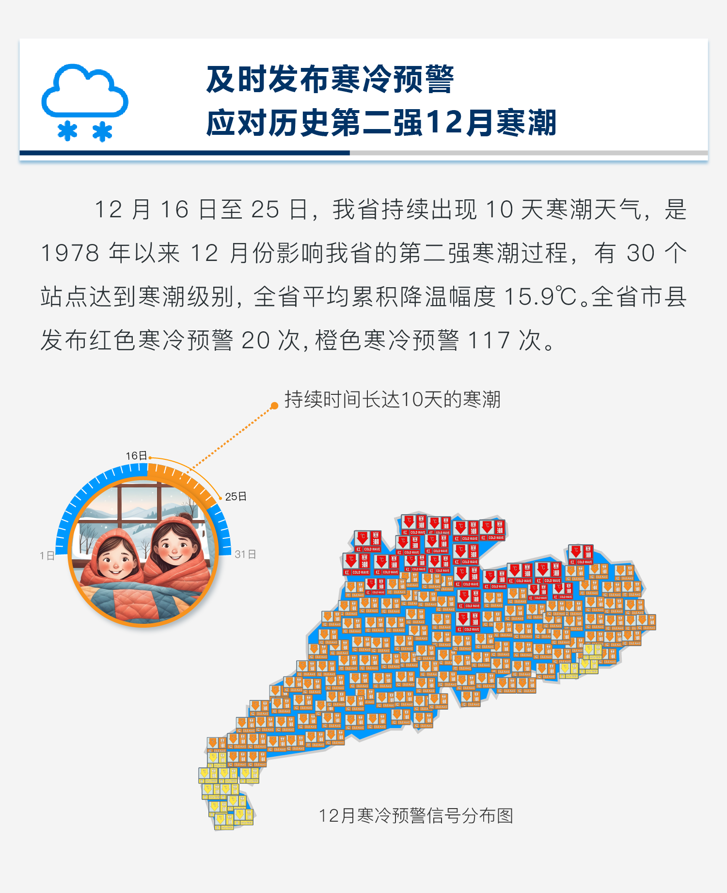 去年12月16日至25日,广东省持续出现10天寒潮天气,是1978年以来12月份影响广东省的第二强寒潮过程,有30个站点达到寒潮级别,全省平均累计降温幅度15.9℃。全省市县发布红色寒冷预警20次,橙色寒冷预警117次。