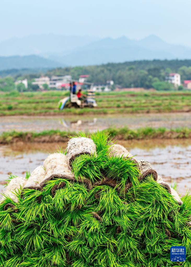 4月9日,在湖南省娄底市双峰县荷叶镇清泉村,农民驾驶农机进行抛秧作业。