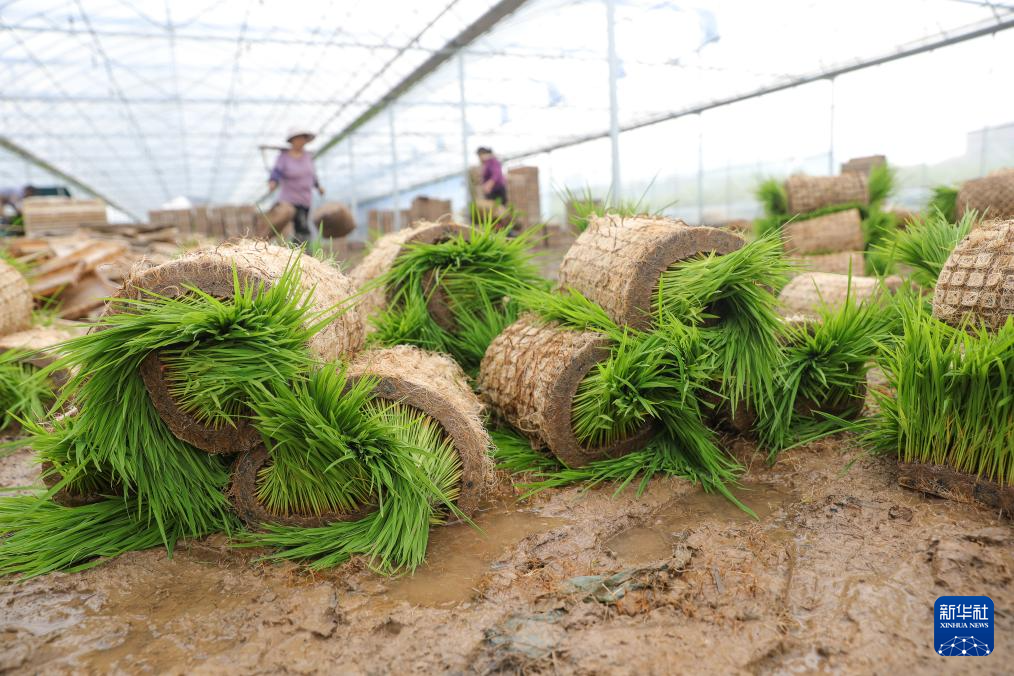 4月9日,在湖南省衡阳县西渡镇三联社区,农民在育秧苗大棚中起秧。