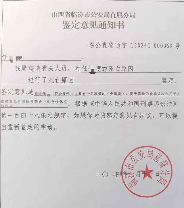 3月13日,警方出示的鉴定意见显示,“任夏符合被他人以具有一定质量的(金属类)、便于挥动的砍器多次作用于头面部致急性颅脑损伤合并创伤性休克而死亡。”