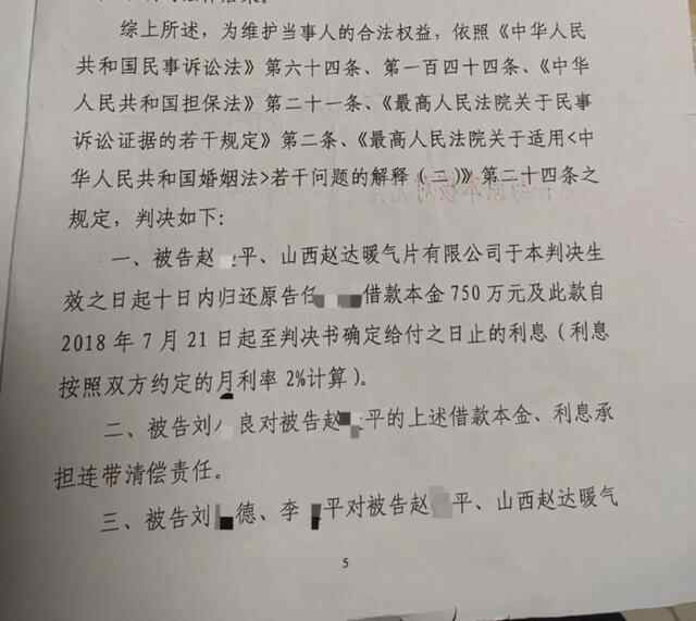 2018年11月26日,临汾市尧都区人民法院判决赵某平、山西赵达暖气片有限公司于本判决生效之日起十日内归还原告本金750万元及利息,被告刘某良(赵某平的妻子)、刘某德、李某平承担连带清偿责任。