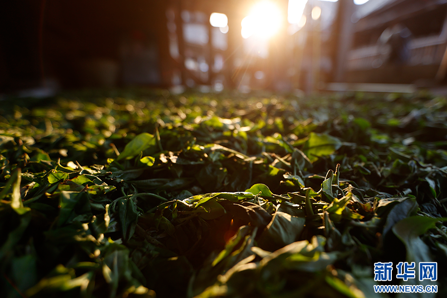 云南普洱翁基古寨,落日余晖洒在晾晒的茶叶上(4月1日摄)。新华网 徐华陵 摄