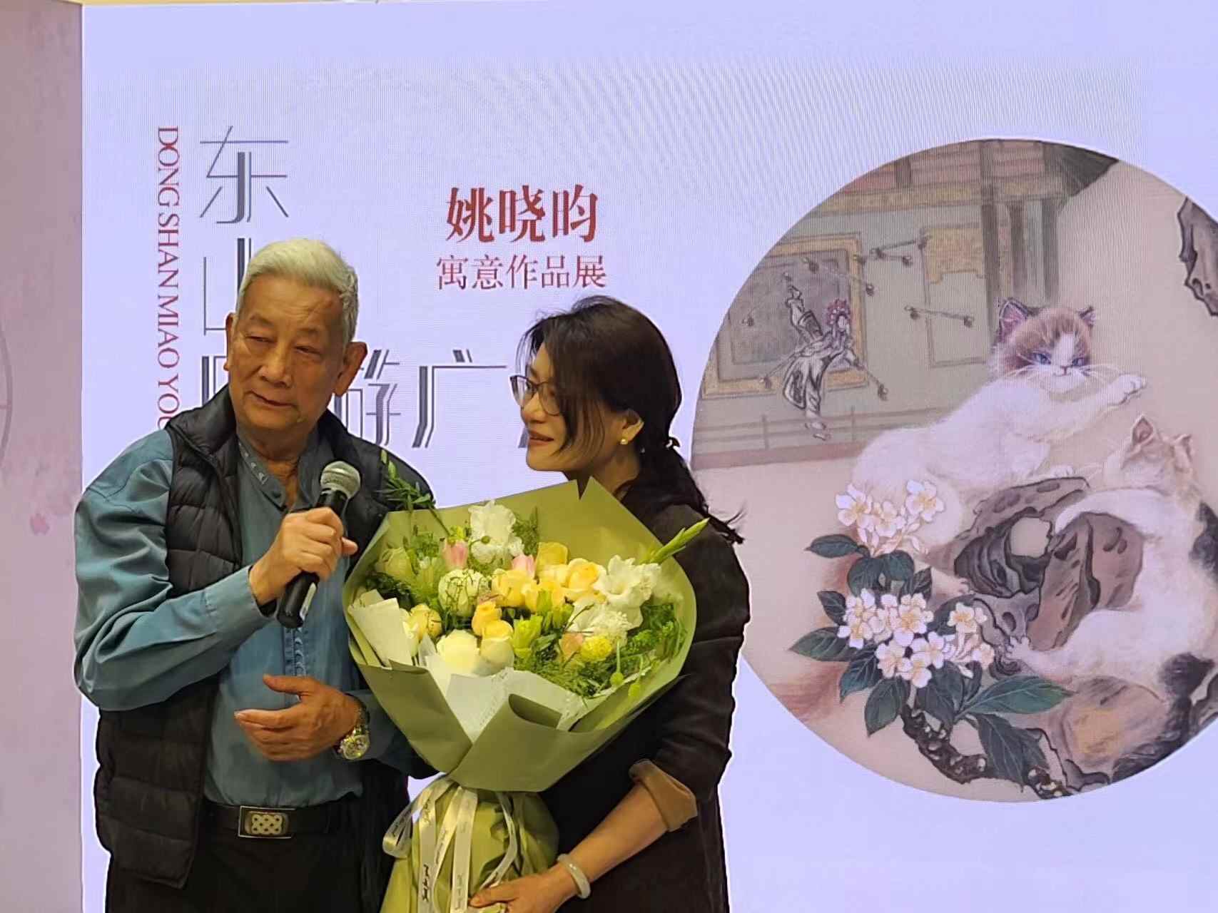 展览现场,只见“东山洋楼喵”“越图喵”“非遗喵”“咖啡喵”“二十四节气喵”……共同构成了“东山喵”家族,萌翻众人。它们或娇憨,或傲娇,或优雅,或时尚,或知性,有不同的性情与故事,体现了不同的文化意涵,市民游客纷纷与之合影留念。紧密围绕“东山喵游广府”的主题,姚晓昀的作品还精妙呈现了广府建筑、广府非遗、广府民俗等,观众跟着“东山喵”的脚步,阅赏杨箕龙舟、广州戏服、粤剧粤曲、沙湾飘色、开平碉楼……可谓一日读遍广府风情。现场还展出姚晓昀精心创作的“鹿”“鱼”“花”系列作品,以及旗袍作品,美轮美奂,寓意深刻。姚晓昀还以工笔画的巧密精细,用心描摹广州的木棉、紫荆、鸡蛋花等本土花卉,表现“花城”的万紫千红、芳馨柔丽,笔触之间,尽显深情,引起众多市民游客的强烈关注。