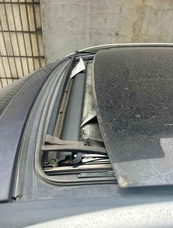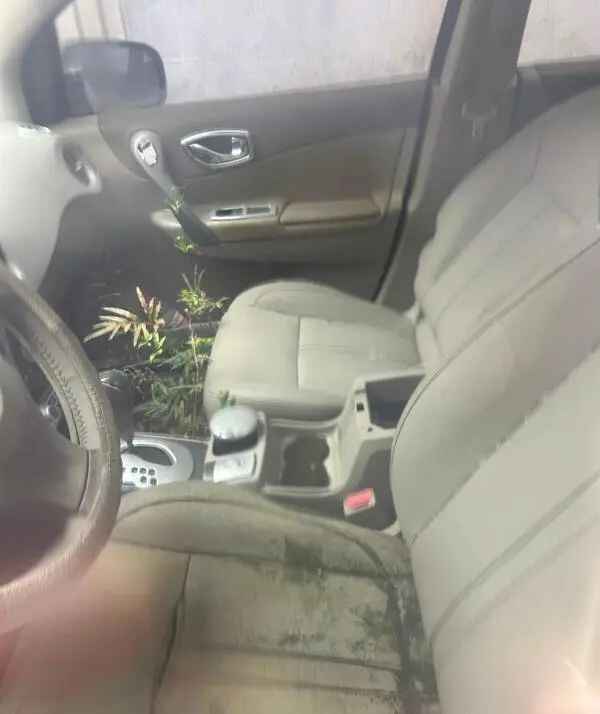 从车窗往里看,副驾驶座下长着的绿草已高过椅面,驾驶座和水杯架上有霉状物,后备厢堆着盒子、文件等。