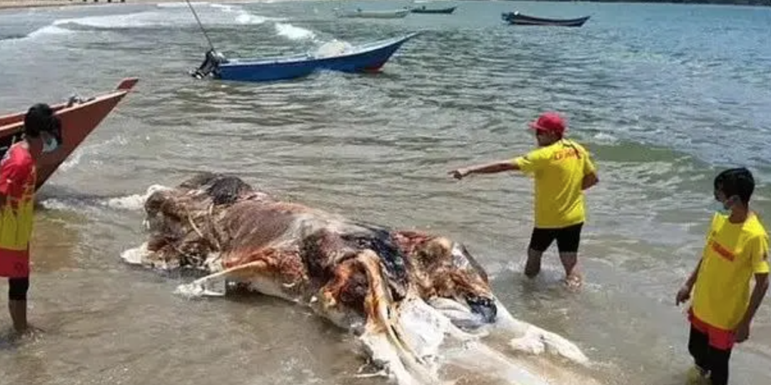 据《每日邮报》4月10日消息,在马来西亚梅拉诺湾海滩上,一不明生物的巨型尸体被冲上岸,肉眼难以辨认物种,正在等官方DNA鉴定。马来西亚海警救援队近日对外宣布,工作人员在梅拉诺湾海滩巡逻时发现一具巨大的动物尸体。