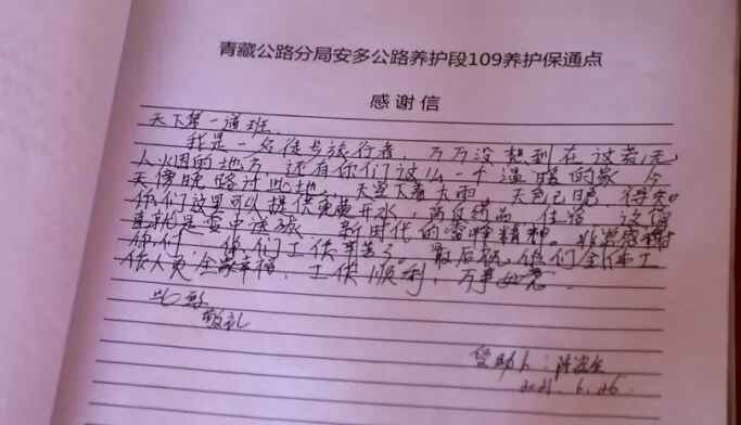 109养护保通点职工们长期无私地服务社会,却极为珍爱地保存着一份特殊的社会反馈——3000多封来自祖国各地的游客的感谢信,以及记载着无数条表达敬意和谢意的留言本,感谢信和留言无不情真意切:“天下第一道班,天下第一温暖”“大爱无疆,道班工人高尚”“在109养护保通点照到了镜子,惊喜不已”“感谢天下第一道班的工人,你们是世界上最可爱的人”“寒风无情人有情”“救助站里见真情,藏汉同胞是一家”“解我忧难铭记心,不是亲人胜亲人”……
