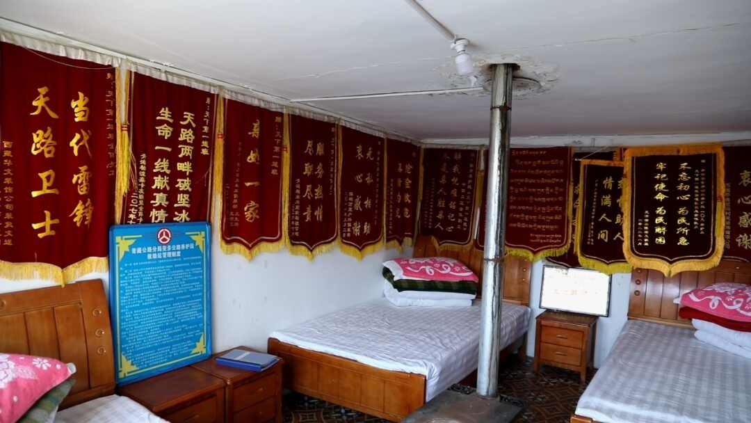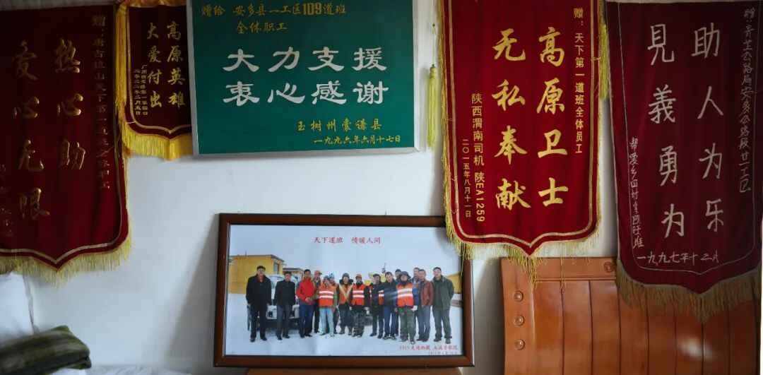 109养护保通点会议室的四面墙上,也挂满了各地游客送来的、寄来的锦旗,以及道班荣获的各种荣誉奖牌。对109养护保通点的职工来说,这些便是对他们艰苦劳动和无私奉献给予的最高褒奖。