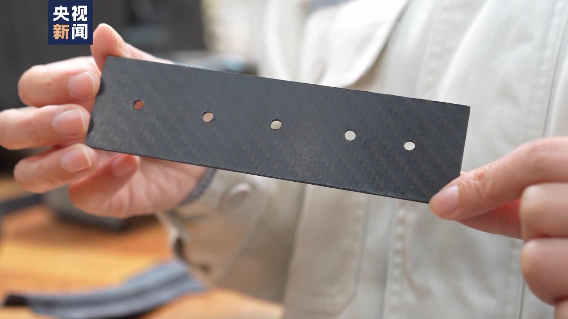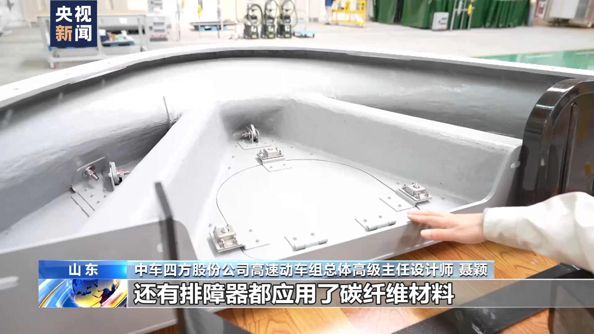 中车四方股份公司高速动车组总体高级主任设计师 聂颖:我手里拿的是一个碳纤维的垫片,像CR450,设备舱还有排障器都应用了碳纤维材料,比传统材料能够降低30%的重量,这样车身更轻,跑起来能耗更低。
