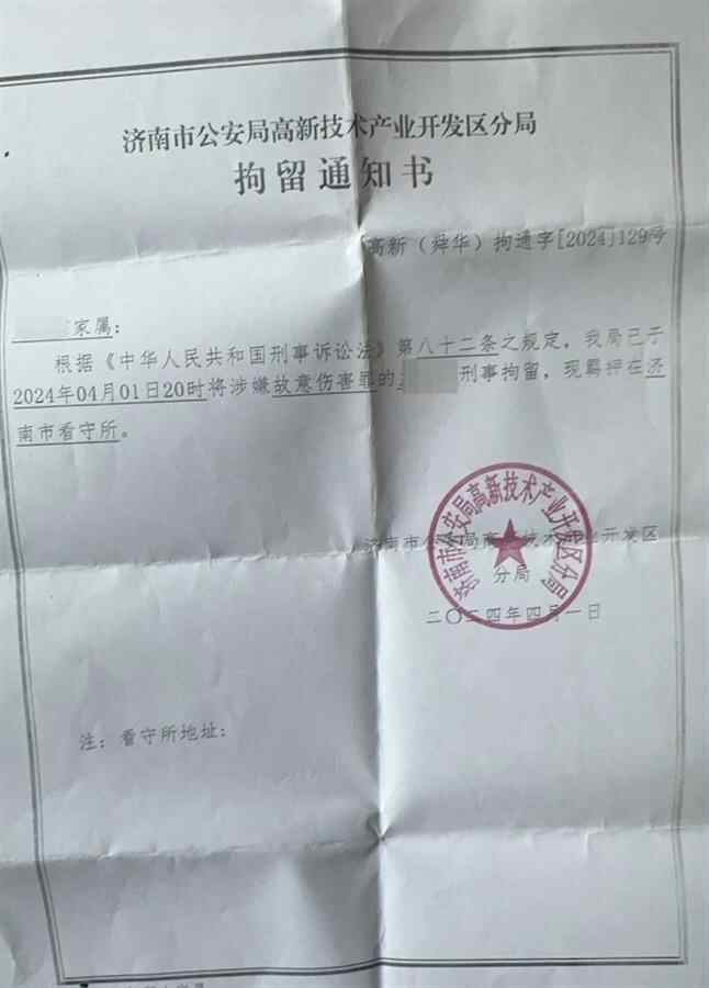 当晚警方赶到现场进行处置,双方签署了谅解书。不过4月1日,小超父亲收到了警方的拘留通知书,显示小超因涉嫌故意伤害罪被刑事拘留。