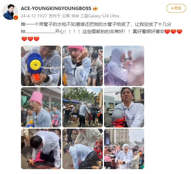当天晚上,黄子韬还在微博中发布了自己被泼的图片,并写道:“开心!!!!”