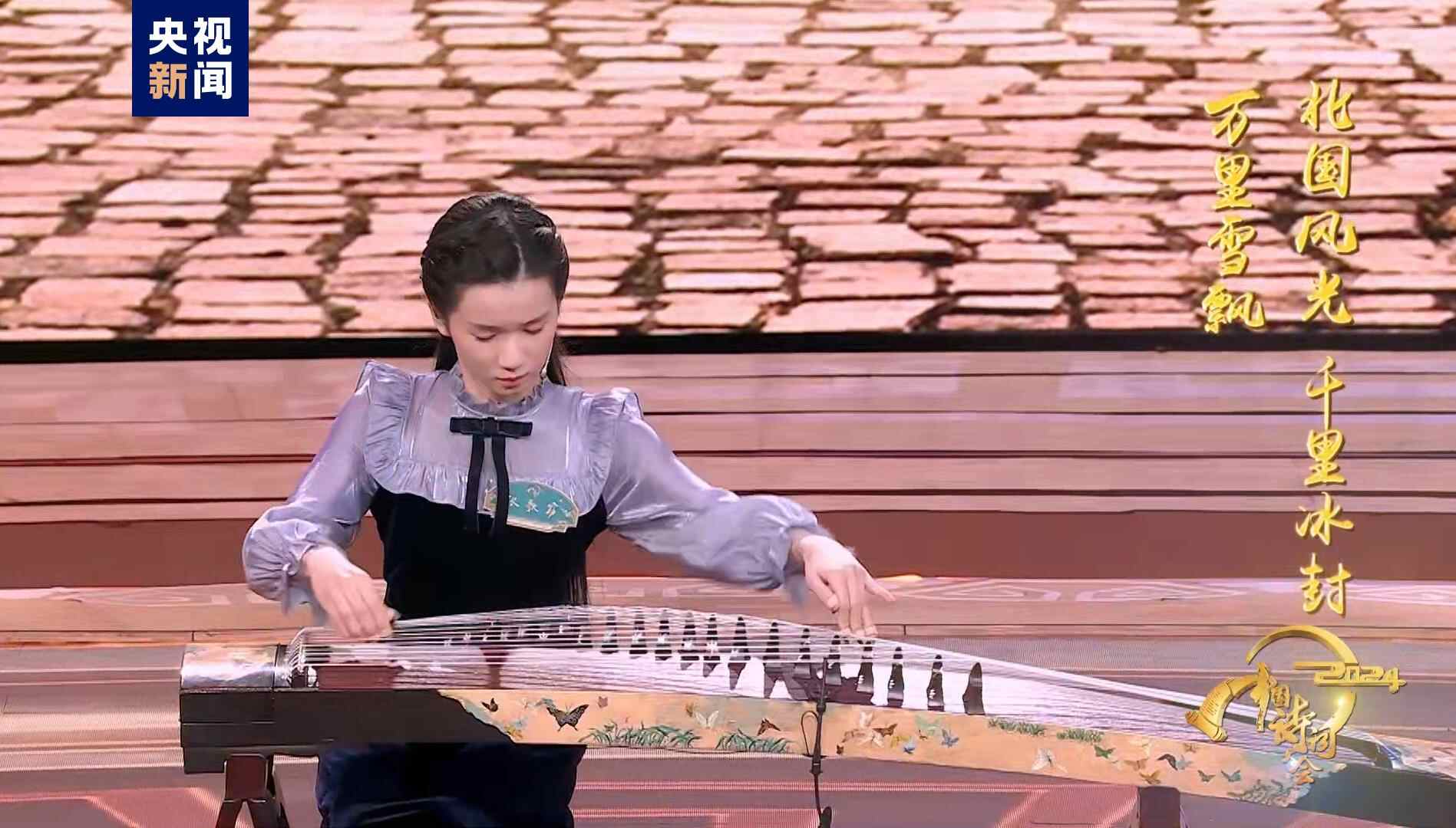 “诵明月之诗,歌窈窕之章”,来自中央音乐学院附中古筝专业的少女张歌窈在登场时向全场观众展示了自己的拿手绝活:用古筝表达诗词意境,“嘈嘈切切错杂弹,大珠小珠落玉盘”,在她的指尖流淌出毛主席笔下“北国风光,千里冰封,万里雪飘”的冬日萧瑟,于音律浮动间尽传千古之妙,技惊四座,令主持人和嘉宾都赞叹不已。