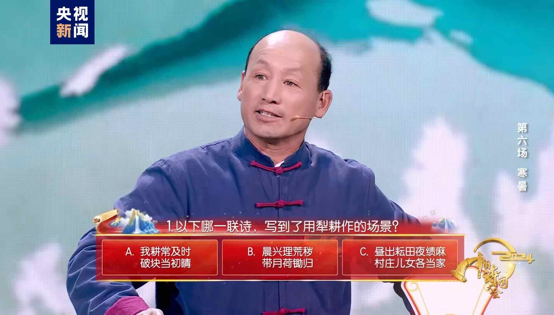 “晨兴理荒秽,带月荷锄归”,在国家的大力帮扶下,原本千里戈壁的磴口县万象“耕”新,农民收入显著提高,他切身感受到农业生产机械化普及、特色农产品畅销国内外等变化带给老百姓的好处。朴实的杨大哥在现场和大家分享自己种的辣椒、玉米等农作物,一口咬下,清脆香甜、有滋有味,生动流露出中国人把饭碗牢牢抓在自己手里的幸福感,同时他发挥自身优势,在涉及农业知识的题目中回答正确,在诗词中与自己热爱的农耕生活再次温暖相逢。