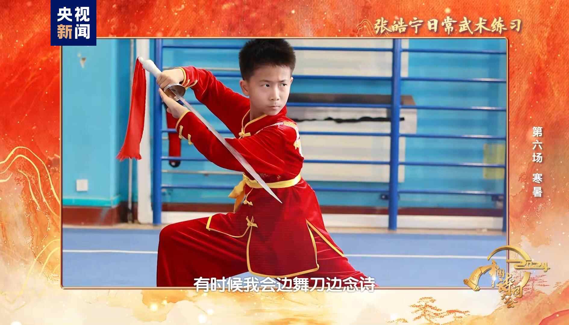 少年如初春之萌动,如朝日之蓬勃,如百卉之含苞。“鹏北海,凤朝阳,又携书剑路茫茫”,说起蓬勃春机,没有什么比少年人更适合。当一袭红衣的武术少年张皓宁刚一登场,就让大家眼前一亮:三岁读诗、四岁习武、边舞刀边念诗的他,小小年纪就展现出“银鞍照白马、飒沓如流星”的唐代侠客风貌。