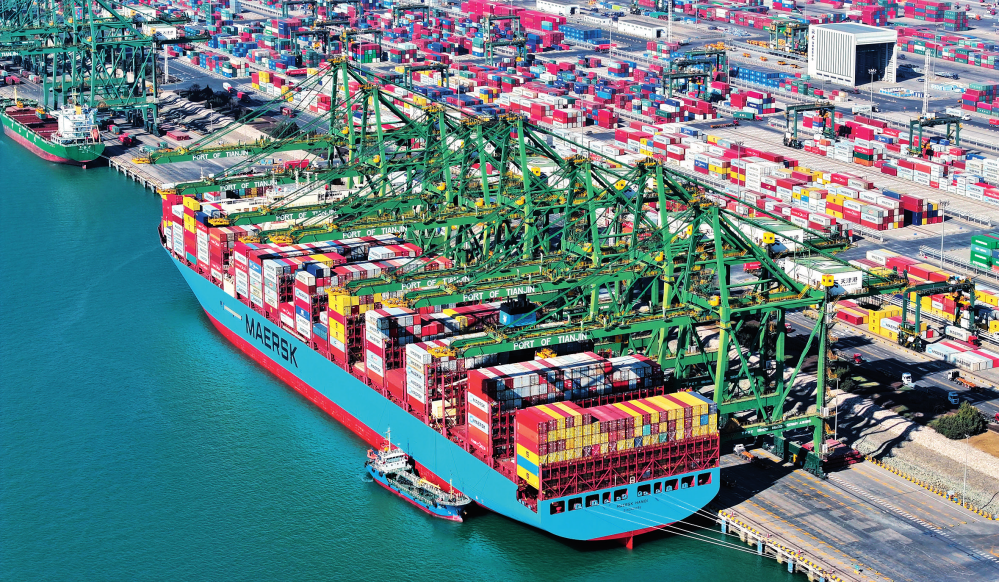 货轮靠泊在天津港北航道内的泊位中(2024 年 3 月 20 日摄)赵子硕摄 / 本刊
