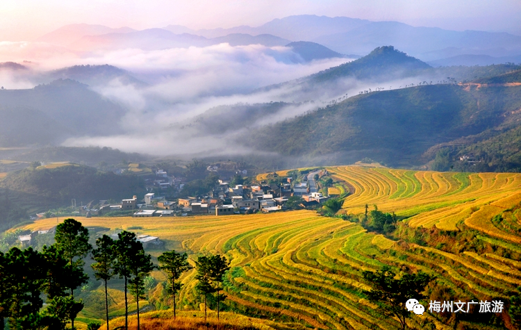 登上景区内的观景台,高低错落、层层叠叠的千亩梯田映入眼帘,山脚下的客家古屋炊烟袅袅,清风拂面,感受自然的美好与宁静。