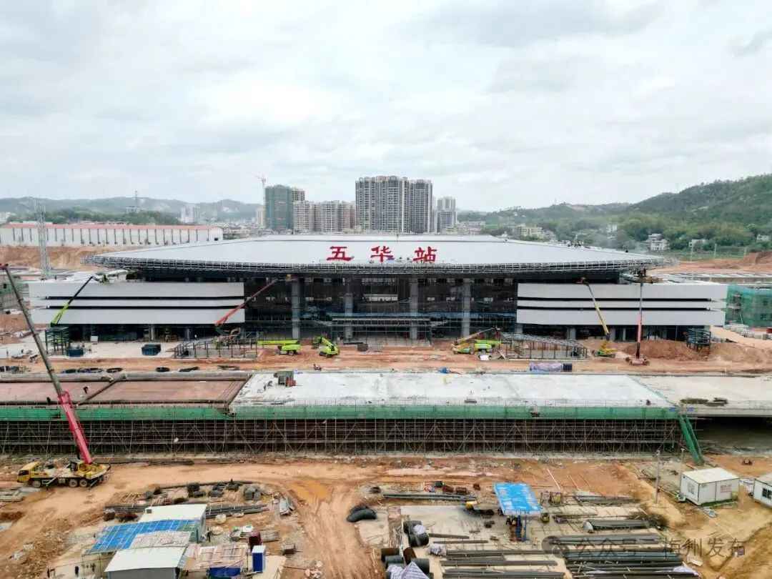 五华站主体结构、钢结构金属屋面已完成,装饰装修、机电设备安装分别完成62%、80%,站前广场配套设施已完成40%,正在按照6月底完成的目标全力推进。