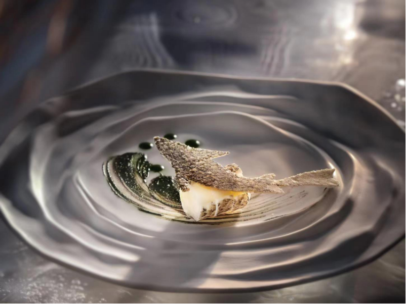 以该餐厅的招牌菜式潮跃鱼饭为例,这道菜品的设计巧妙融合了潮汕地区的文化精髓与海洋元素,将传统潮汕鱼饭提升至艺术享受的高度。潮跃鱼饭选用肉质鲜嫩的鱼肉,搭配墨鱼汁与普宁豆酱的独特调味,以及金黄酥脆的炸鱼皮,使得每一口都充满了咸鲜与多层次的味觉享受。该菜式也荣获黑珍珠餐厅指南首届“年度菜品”称号,通过这道鱼饭,将潮汕的饮食文化推向了更广阔的舞台。