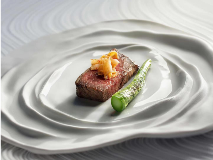 另外,沙茶牛肉也是潮汕美食的经典代表。潮跃精选澳大利亚和牛作为主要食材,将充满地方特色的沙茶酱与现代烹饪手法相结合,独创出一种冰冻的沙茶牛油卷。上菜时,这种特制的沙茶牛油卷像白松露一片片落下,这样的呈现方式,不仅令菜品散发出诱人的香气,更在口感上营造出冷热交替、鲜美香浓的独特体验,令人难忘。