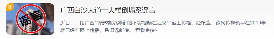 经南宁互联网举报·辟谣平台核查,该网传视频早在2019年就已经在网上传播,系旧谣新传。19日,话题#广西白沙大道一大楼倒塌系谣言#冲上热搜。