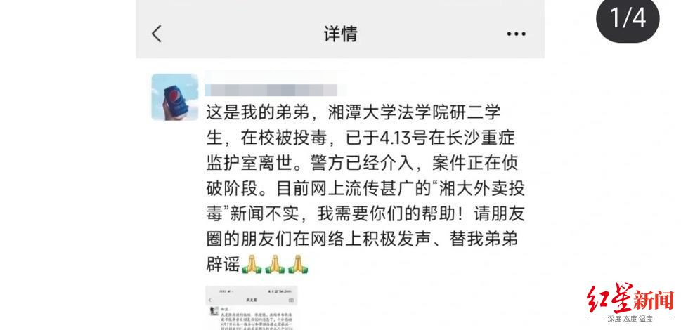 20日上午,记者通过中间人联系上张某某姐姐询问事情进展,对方表示感谢,并称警方正在调查,暂时不想影响办案。对于谣言,张某某姐姐也在社交平台称,目前网上流传甚广的“湘大外卖投毒”不实,希望朋友们能替弟弟发声辟谣。湘潭大学也曾表示,网传“偷外卖被投毒”不属实,其他情况仍在调查中。