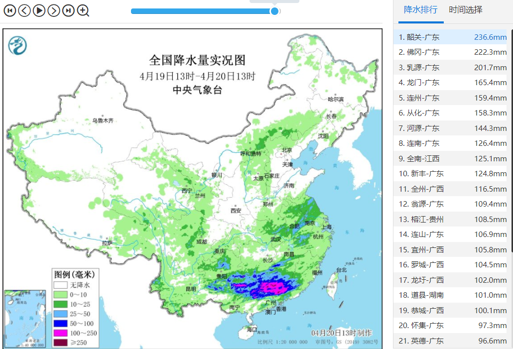 截至4月19日,广东中北部大面积站点4月累积降雨量已经打破历史同期纪录。其中,广东韶关,截至今天早晨08时的4月累积降水量就已达到584.4毫米,提前、大幅打破4月总降雨量纪录417毫米,此外佛冈、英德接下来也极有可能刷新4月总雨量纪录。随着降雨持续进行,广东中北部还有更多地区有望刷新4月整月降水的历史极值纪录。