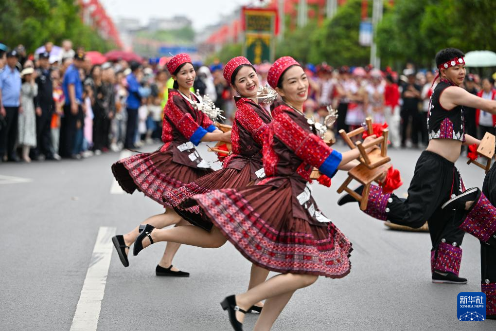4月20日,在湖北省来凤县城区街头,来自贵州的民间艺人在表演苗族板凳舞。