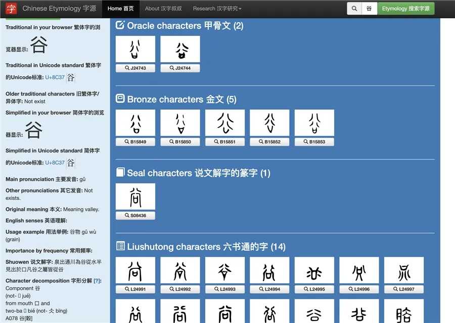 在汉字字源网的输入框里敲入“谷”,包括“甲骨文的字”“说文解字的篆体字”“六书通的字”“金文的字”在内,共计22个字形,揭开了“谷”字的前世今生。
