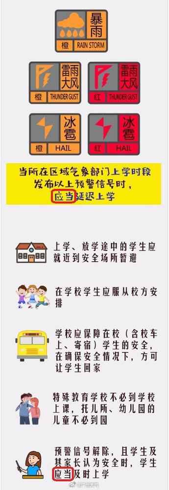 ①当所在区域发布暴雨黄色预警信号时,可以延迟上学;