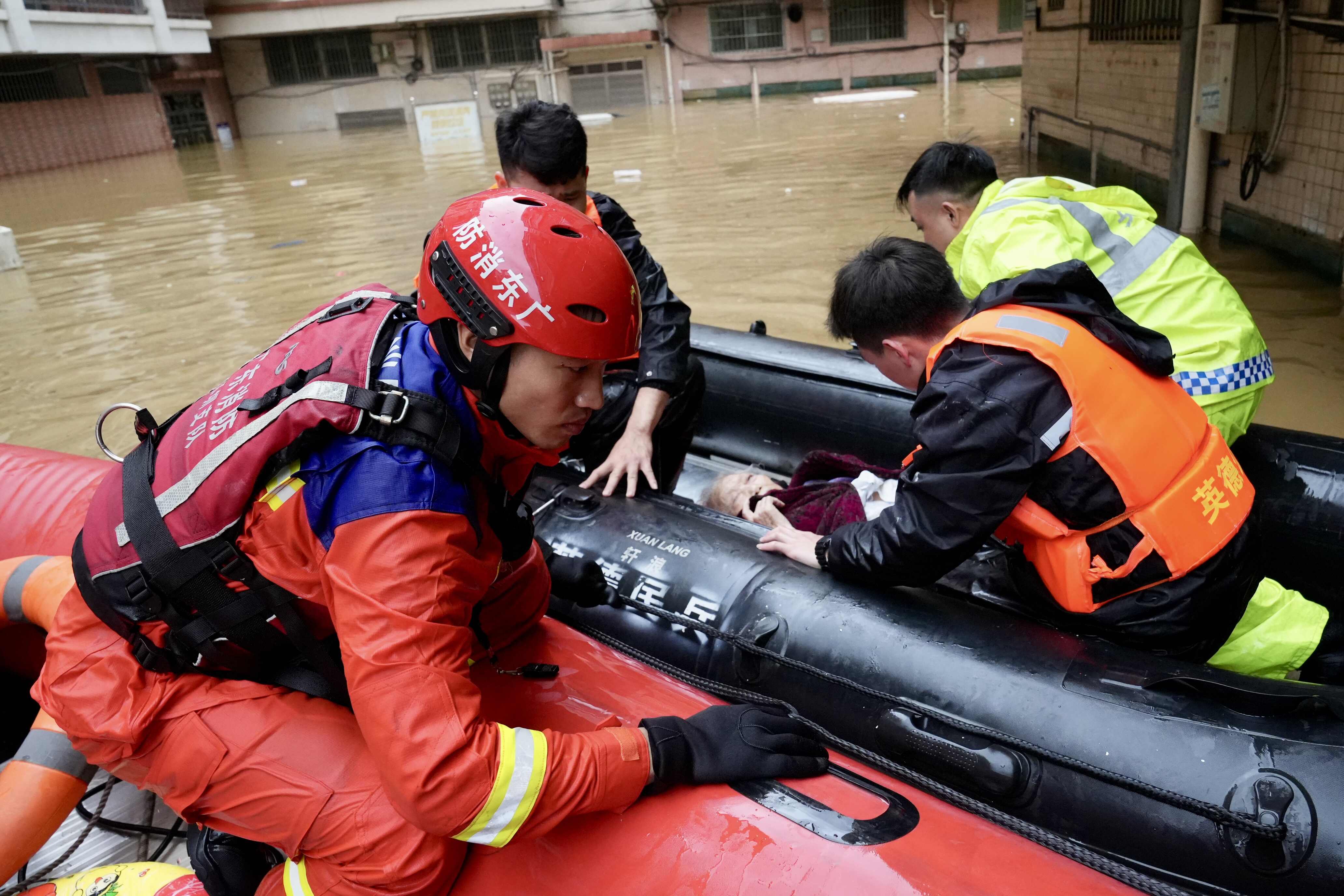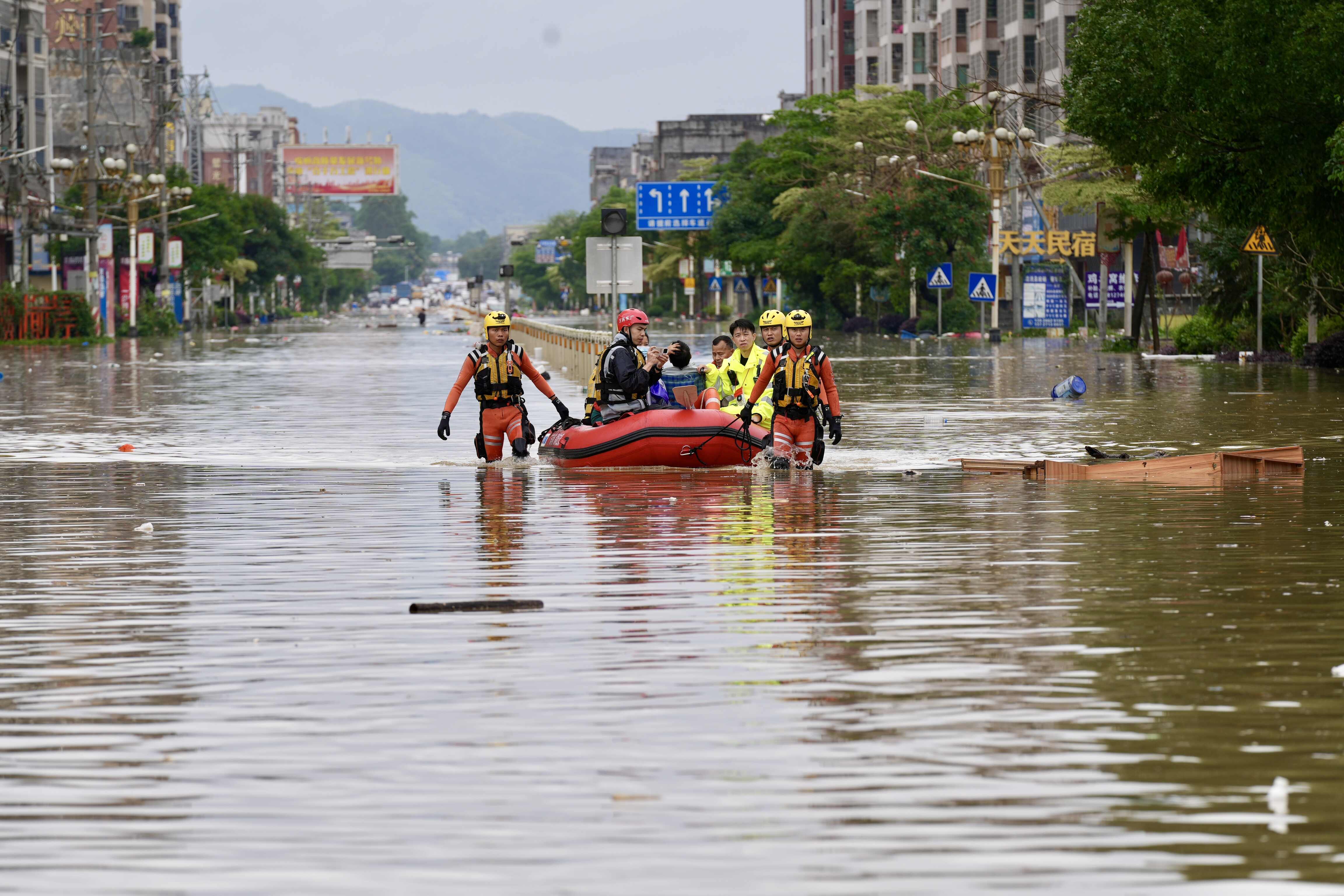4月21日下午,羊城晚报记者来到英德市浛洸镇。受北江水位上涨影响,该镇大部分沿街房屋的一楼已被水淹没。为转移仍被困在水浸区域的急症患者,消防队员、社区工作者、医护人员等各方力量协同合作,共撑“生命之舟”。