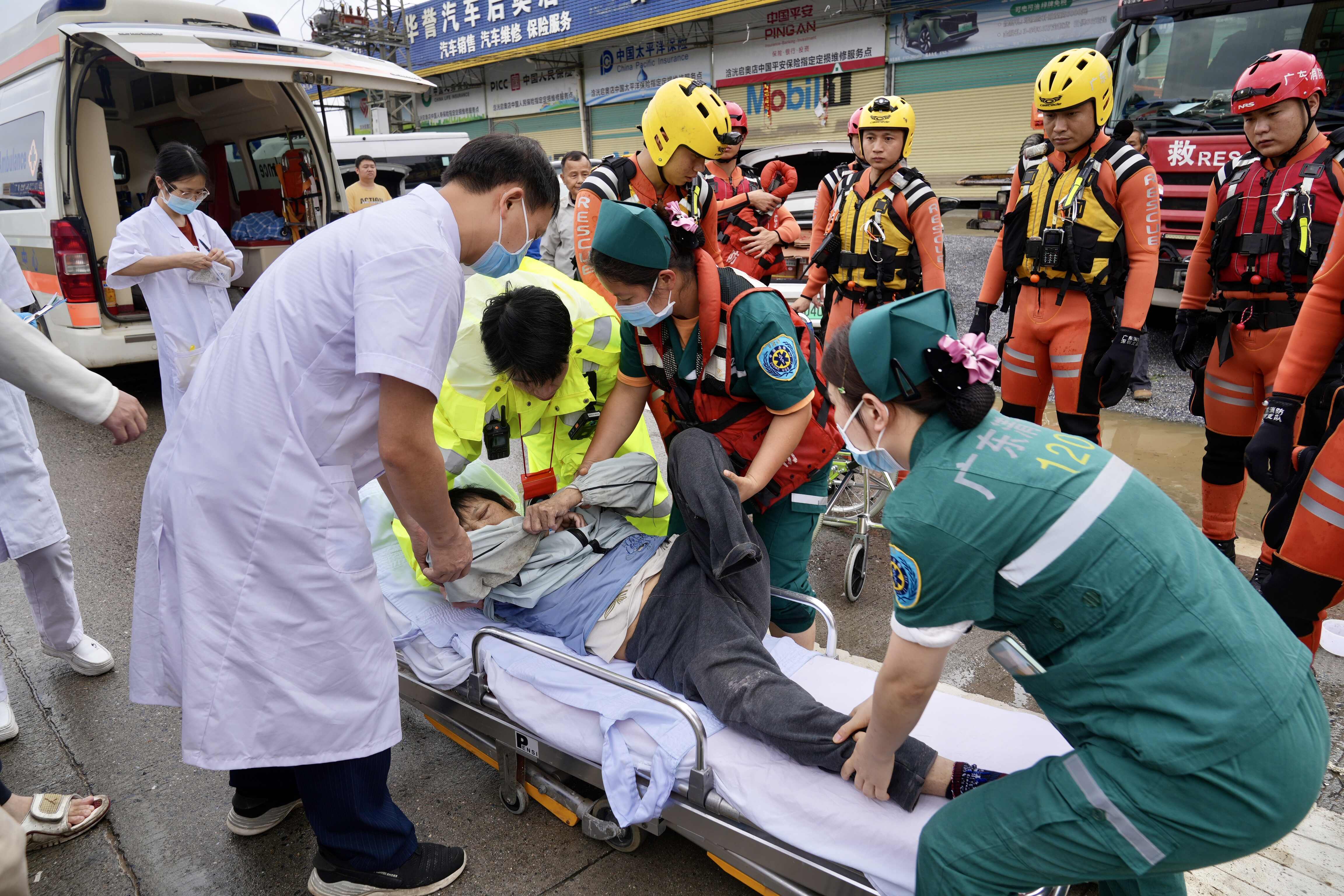 在水浸区域不远处,一辆救护车闪着红光,始终处于待命状态,每当有一位急症患者被转运出来,就会被立刻抬上救护车,送往英德市区的医院治疗。