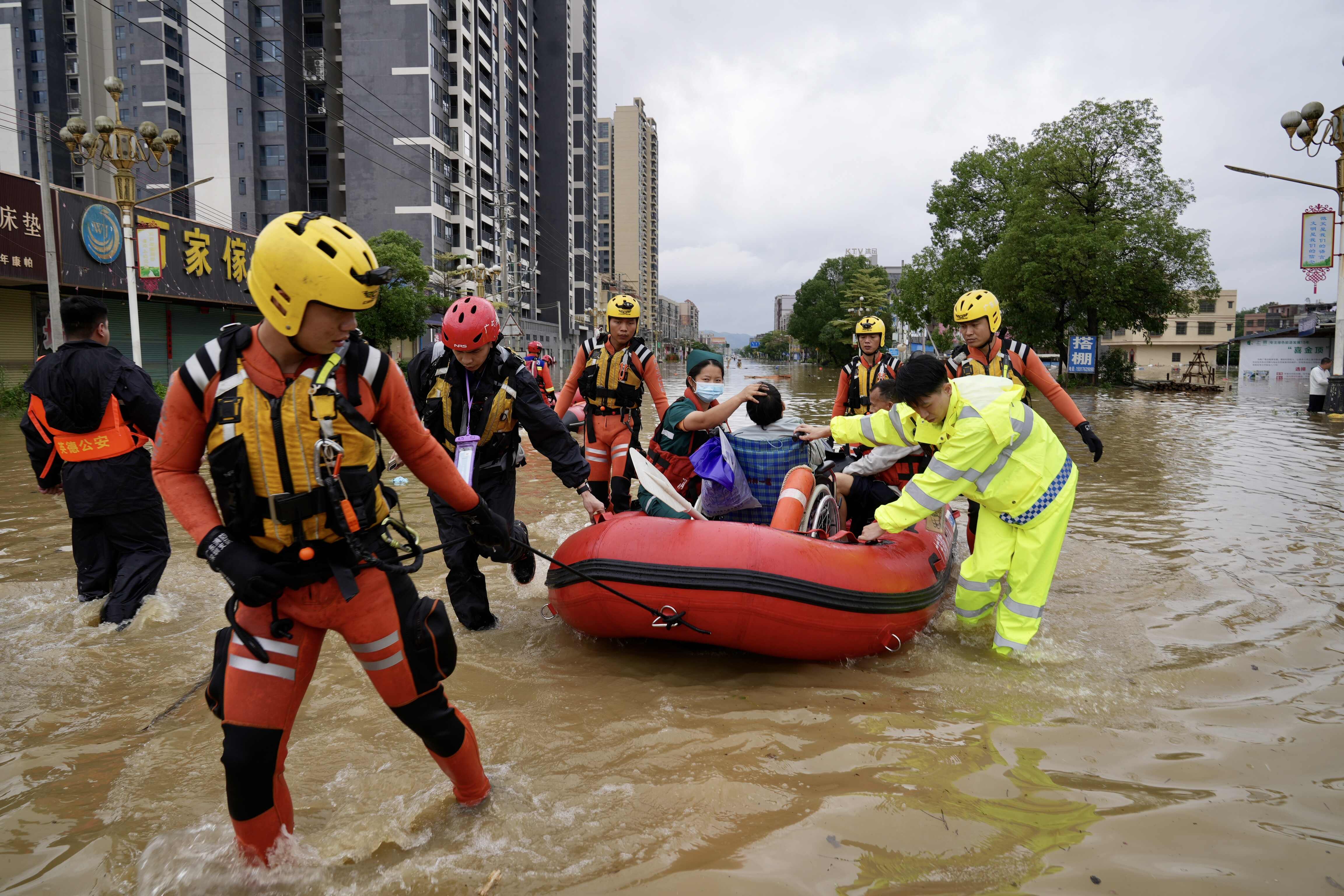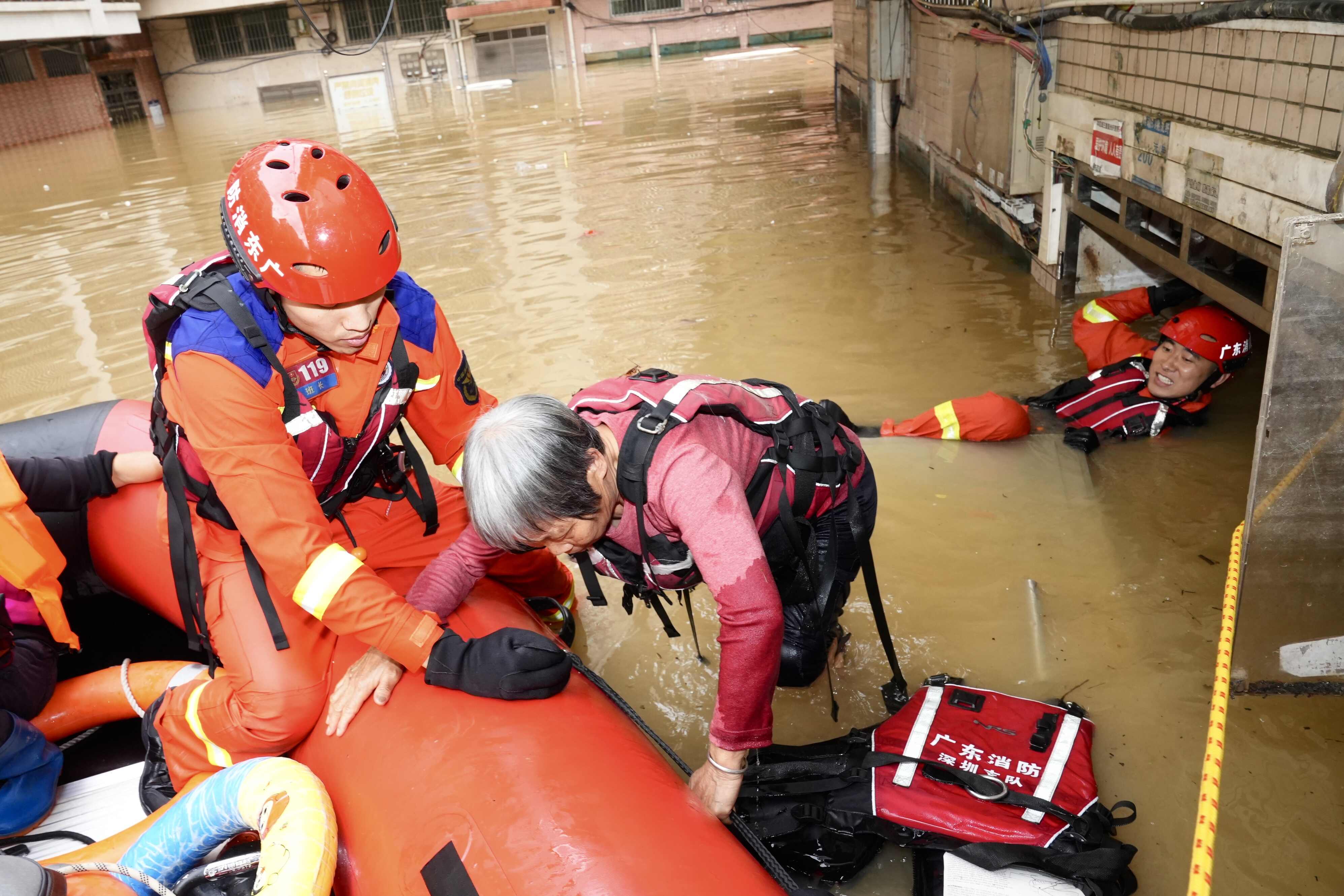 4月21日下午,记者在水浸现场看到,来自深圳市消防救援支队的队员们正乘着橘红色的冲锋舟驶入洪水深处。深圳支队勤务站站长张翔正忙着汇总各方信息,一线消防救援队伍的信息来自119报警、相关政府部门、现场临时求救等,张翔需要为每一个求助者对接合适的救援小组。