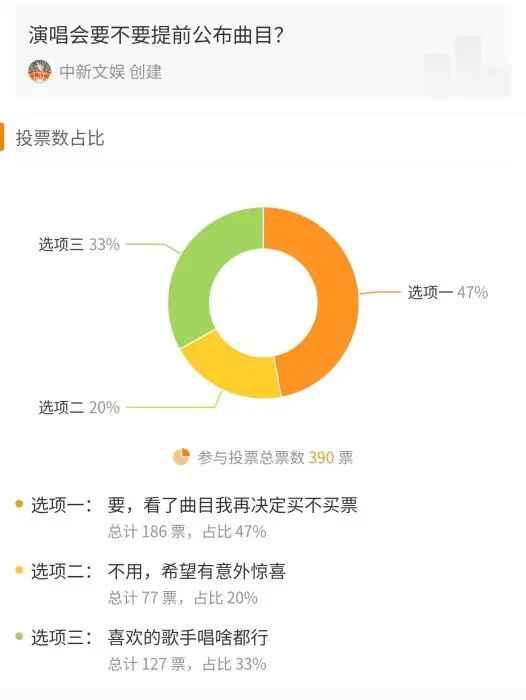 演唱会是否要提前公布曲目呢?在中新文娱发起的一项投票里,47%的网友投给了“要,看了曲目再决定买不买票”,33%的网友则投给了“喜欢的歌手唱啥都行”。
