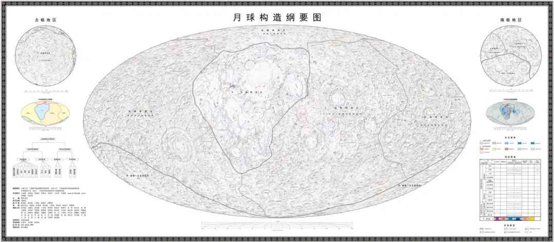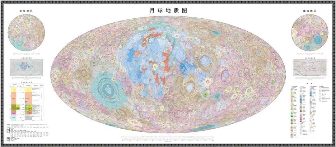 这套图集就像一幅精美的彩绘画卷,用四种基本色调衍生出150种色彩,生动展示了月球“三宙六纪”的不同地质时期。其中,《1:250万月球全月地质图》犹如月球的脸谱,准确标注了12341个撞击坑的位置,81处大型撞击盆地,以及17种岩石类型和14类地质构造,建立了统一的盆地建造亚类的分类体系。