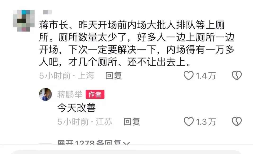 有网友反映,20日开场前内场很多人排队等上厕所,吐槽厕所太少,建议“下次一定要解决”。蒋鹏举回应“21日改善”。