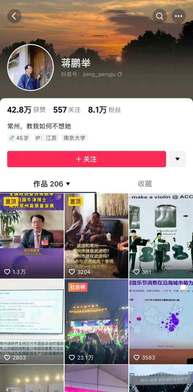 刚刚过去的周末,常州市副市长蒋鹏举观看在当地举办的一场演唱会并在个人抖音号发现场视频,到目前点赞数超23万。
