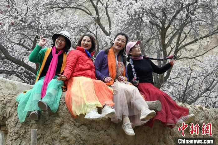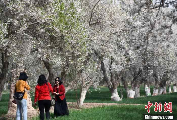 3月31日,多名游客在新疆阿克陶县塔尔塔吉克民族乡巴格艾格孜村的杏花树下拍照。中新网记者孙亭文摄