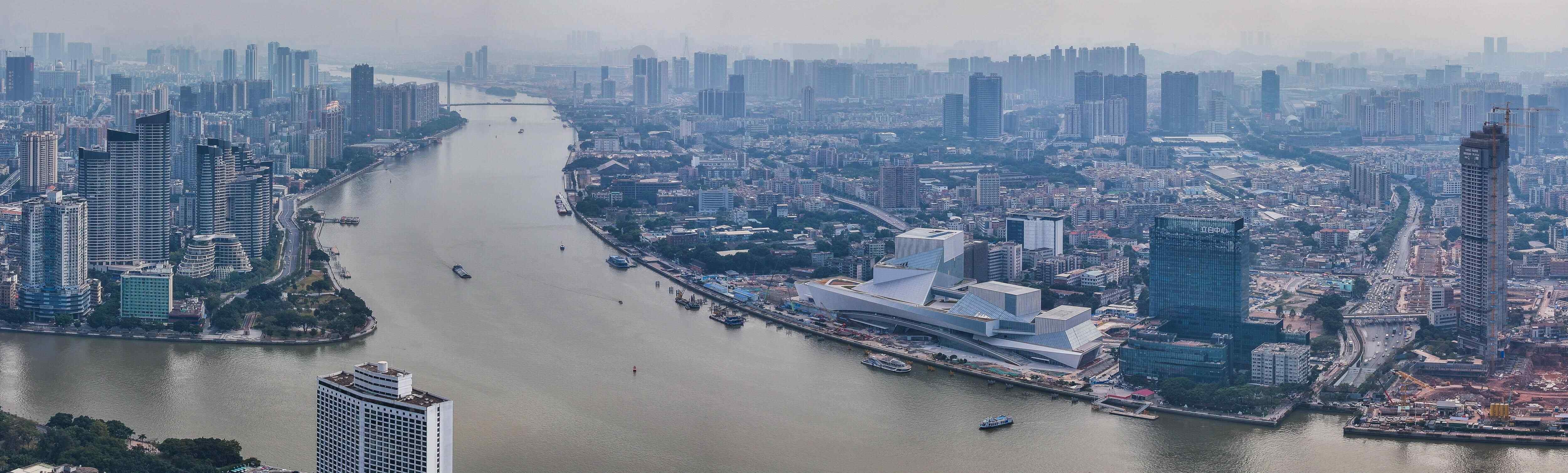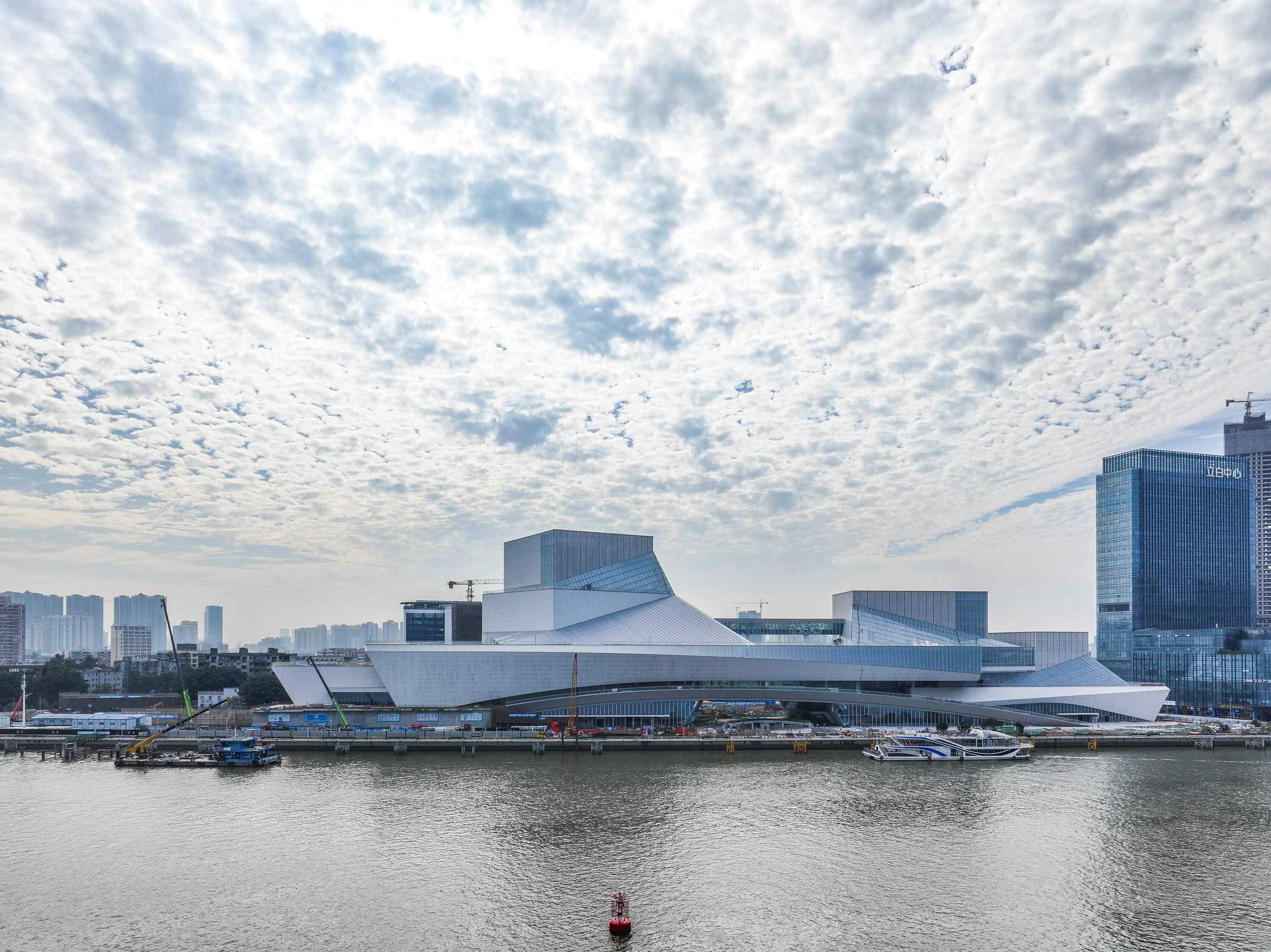 白鹅潭大湾区艺术中心位于珠江最宽处,以海上丝绸之路为起点,与广州十三行、永庆坊、文化公园等文化地标相连,体现了千年商都的开放繁荣,传承因水而兴的城市发展脉络。